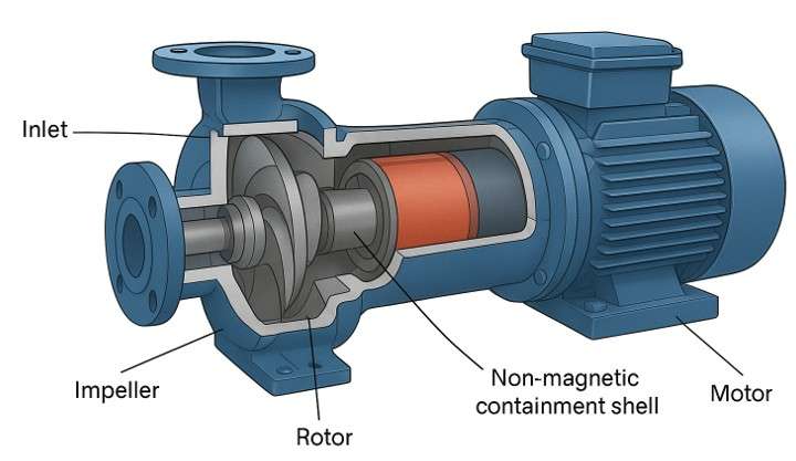 The pump uses a magnetic coupling (outer and inner magnets) to drive the impeller, eliminating seal failure risks. This design prevents leaks, reducing environmental and safety hazards. Additionally, there is reduced maintenance with no seals to replace.